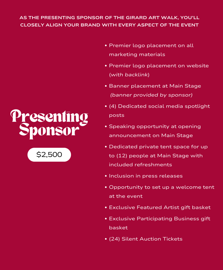 The Girard Art Walk would like to offer a heartfelt thank you to Ms. Sierra Nicholes for choosing to be a Presenting Sponsor for this year’s event.